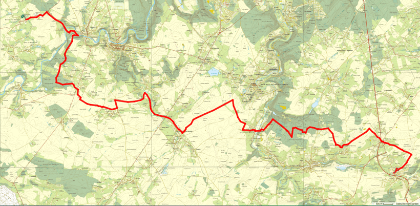 Empruntez la route qui mène vers la gare (photo) puis entrer dans le Bois de Sauci et passez la croix Thiry. Suivez la route à praticabilité médiocre jusqu’à la fin du bois où vous arriverez à Campagne du Dos. Au Vieux Chêne tournez à gauche vers Gourdinne, à la chapelle St Usmé (photo) tout droit.